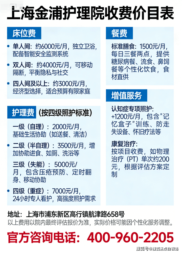 上海金浦护理院采用"床位费+护理费+餐费"的透明结构,无隐形消费,所有项目明码标价。总费用4500元/月起,具体构成如下👇