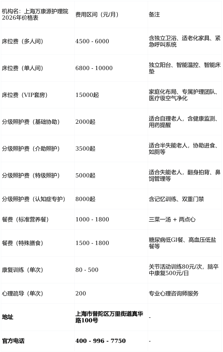 2026上海万康源护理院地址价格:普陀真华路5000元起,专业照护解难题