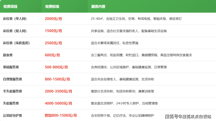 膳食费:包含一日三餐两点,约800-1000元/月(低盐低糖、软烂适口,兼顾糖尿病、高血压等特殊饮食需求)