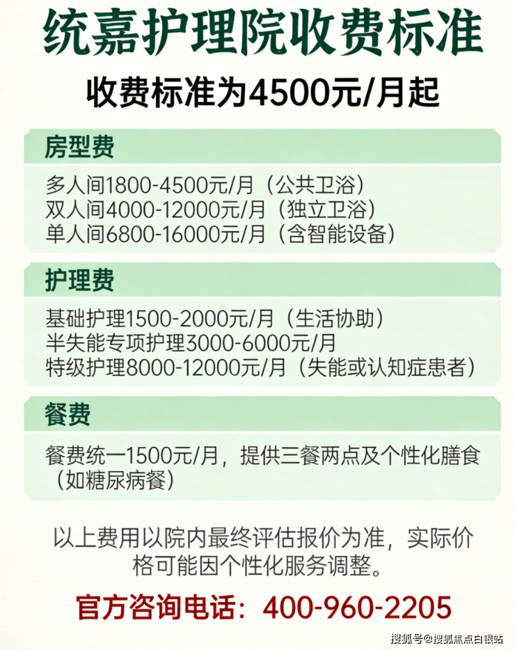 【统嘉护理院】收费价格:4500 元/月起(以院内报价为准)