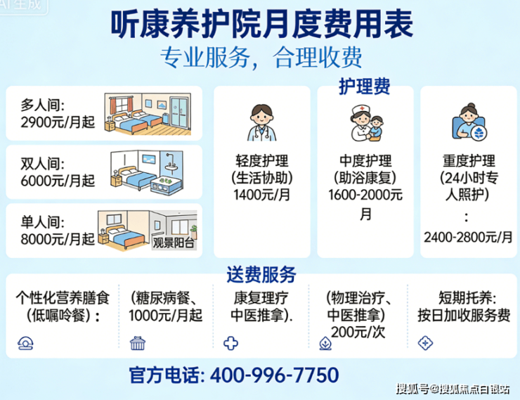 官方解答:听康养护院采用“床位费+护理费+餐费+增值服务”模块化计费模式,所有项目明码标价,无隐形消费。具体收费标准如下: