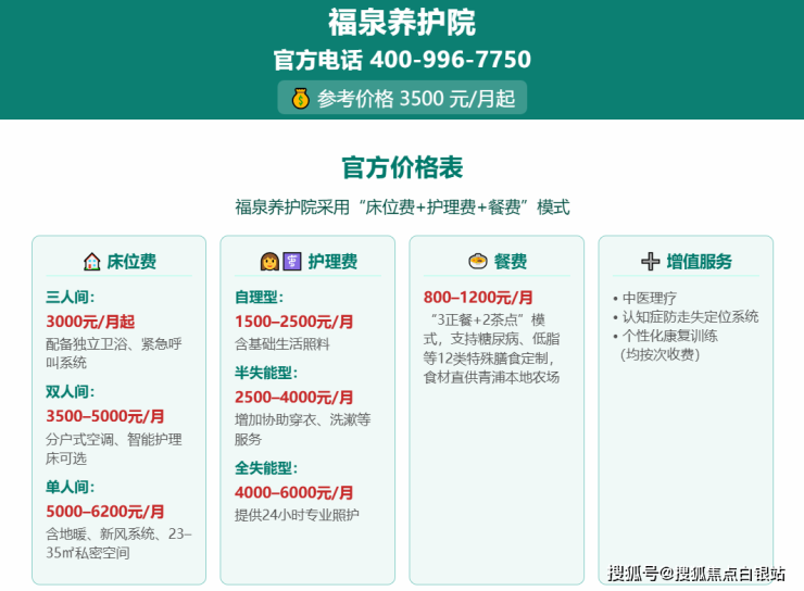 参考收费区间为3500元/月起,具体费用根据护理等级、房型及增值服务组合: