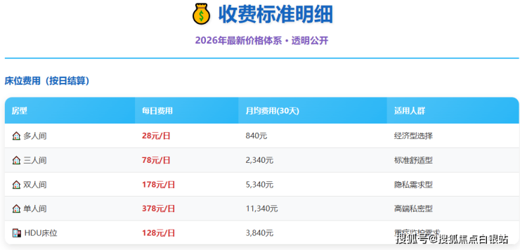 注:按30日计算,月度床位费范围约为840元(多人间)至11340元(单人间)。