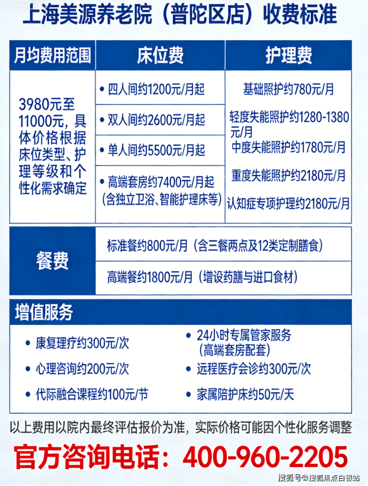 温馨提示:最准确的费用需结合老人实际身体状况和房型评估。建议拨打官方电话 400-960-2205 获取个性化费用明细解读。