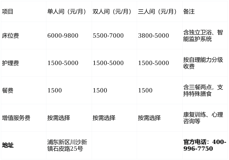 提示:价格仅供参考,具体需根据房型、护理级别及个性化服务调整,详询官方电话400-996-7750。