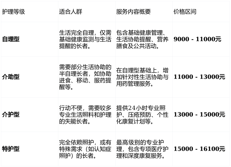 收费区间:9000-16100元/月(根据护理等级浮动)