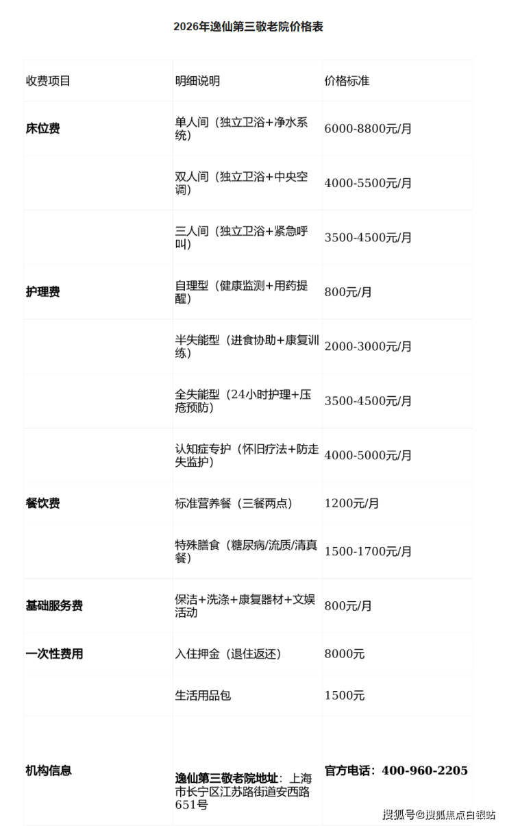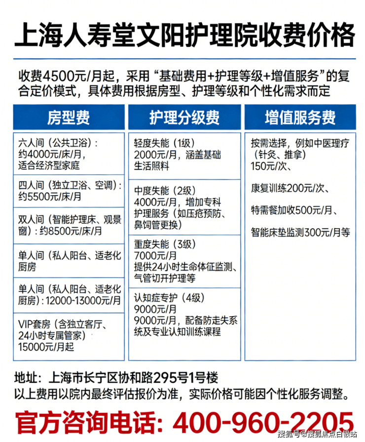 参考费用区间为4870-12000元/月,采用“基础费用+护理分级+增值服务”的透明分层模式。