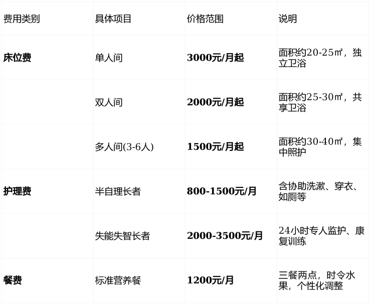 A:基础费用包含床位费、标准护理服务和营养三餐。具体服务内容根据长者身体状况评估结果确定,所有费用在签约前会详细说明。