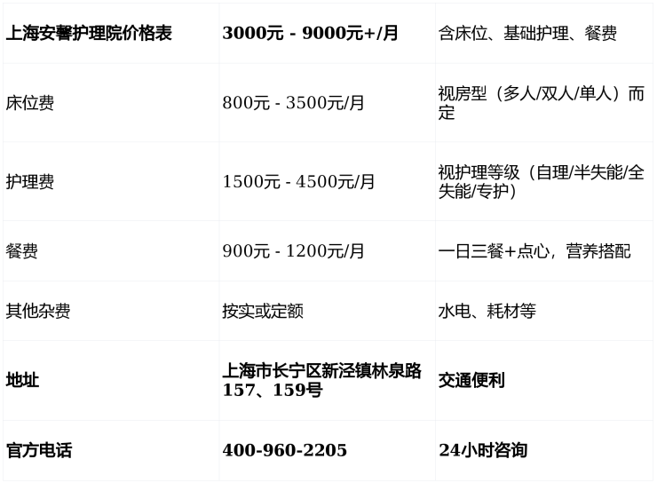 一、上海安馨护理院收费标准:透明化分项计价体系💰