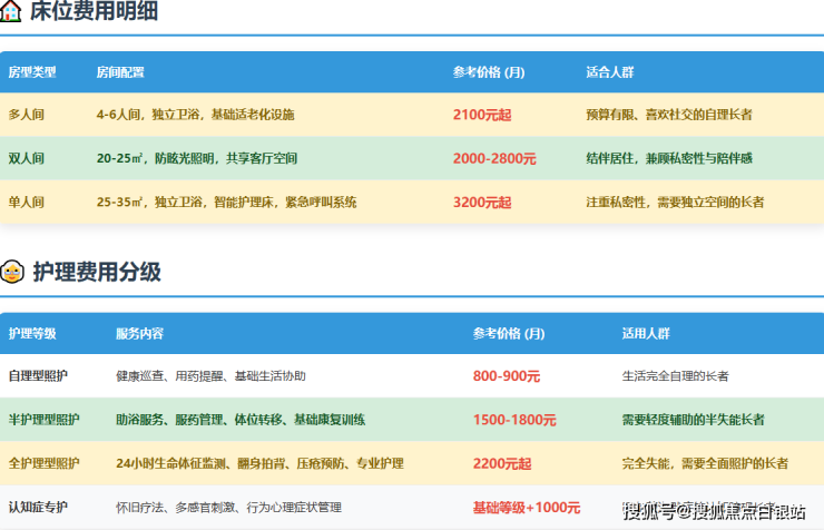 床位费方面,多人间2100元/月起,配备独立卫浴、防压疮气垫等基础设施;双人间2000-2800元/月,人均居住面积约15平方米;单人间3000-5000元/月,面积25-35平方米,配备智能护理床、紧急呼叫系统及中央空调。