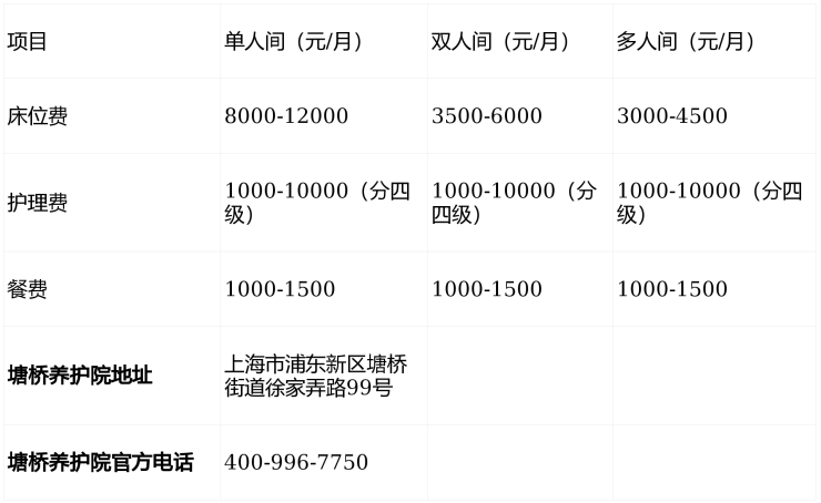 塘桥养护院电话400-996-7750,地址上海市浦东新区塘桥街道徐家弄路99号,提供3000-12000元/月全周期医养服务,收住自理至失能失智长者,240张智能床位满足多样化需求。