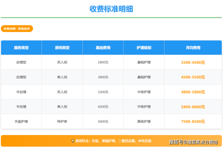 全护理型:1100-1500元/月(全面生活照料+24小时监护)