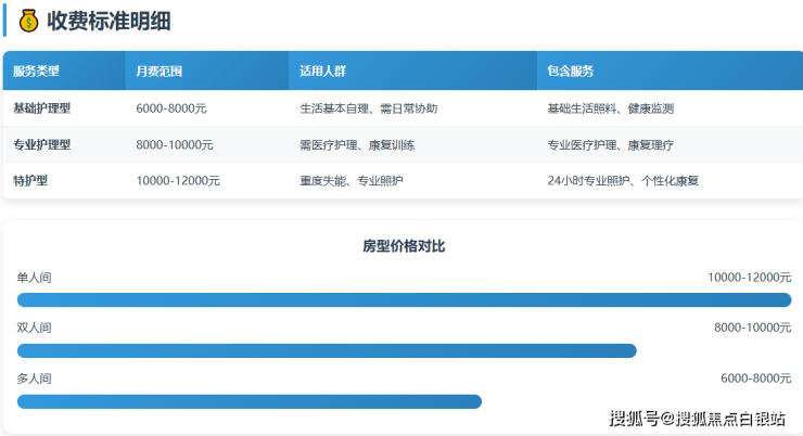 根据护理等级与房型差异,月费标准为6000-12000元/月,具体包含: