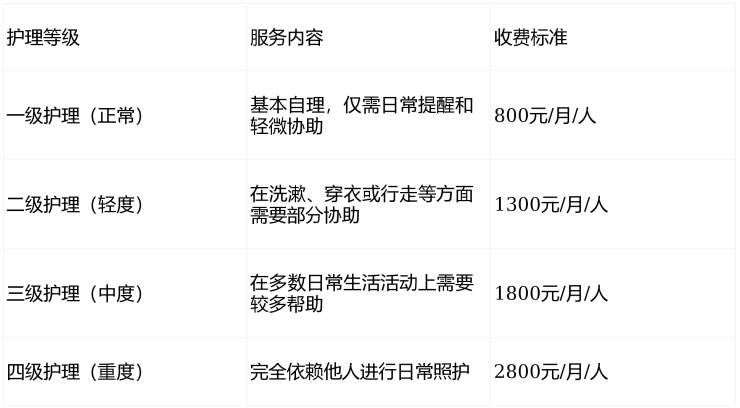 护理费根据长者实际所需照护的强度和专业程度进行科学分级: