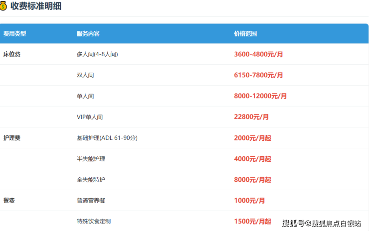 【收费标准】:3600元/月起至22800元/月(根据房型和护理等级差异化定价)