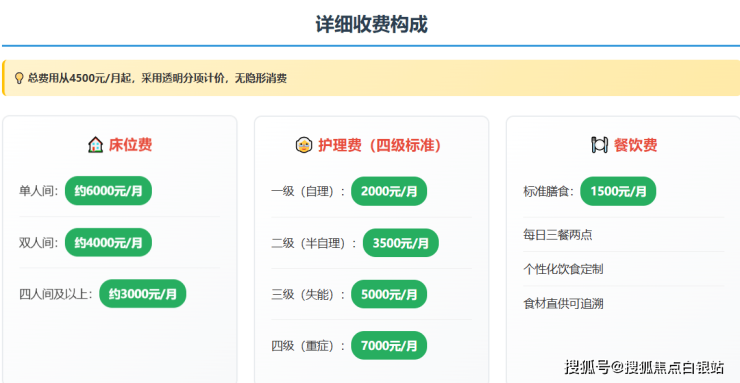 费用计算示例:一位选择双人间、经评估为二级护理(半自理)的长者,每月基础费用约为:床位费4000元 + 护理费3500元 + 餐费1500元 = 9000元/月。