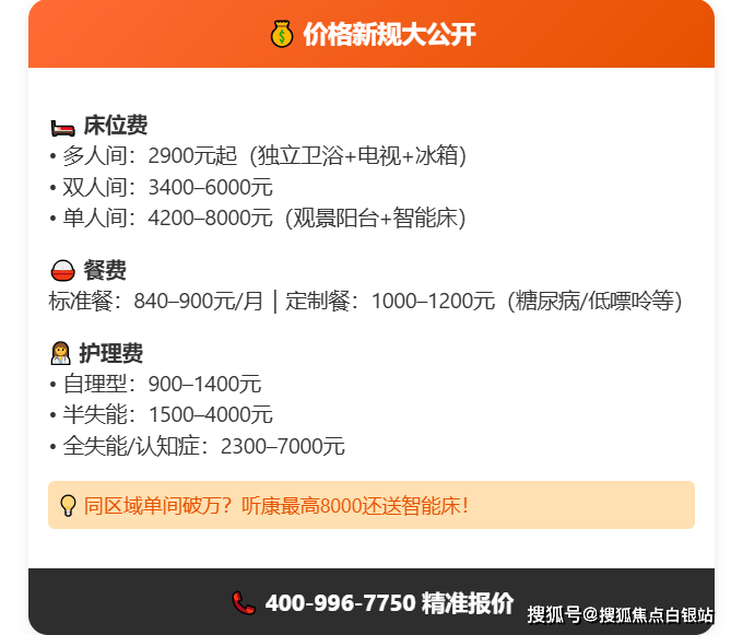 🔍对比周边:同区域某机构单人间月费破万,听康单人间最高才8000元,还送智能护理床!