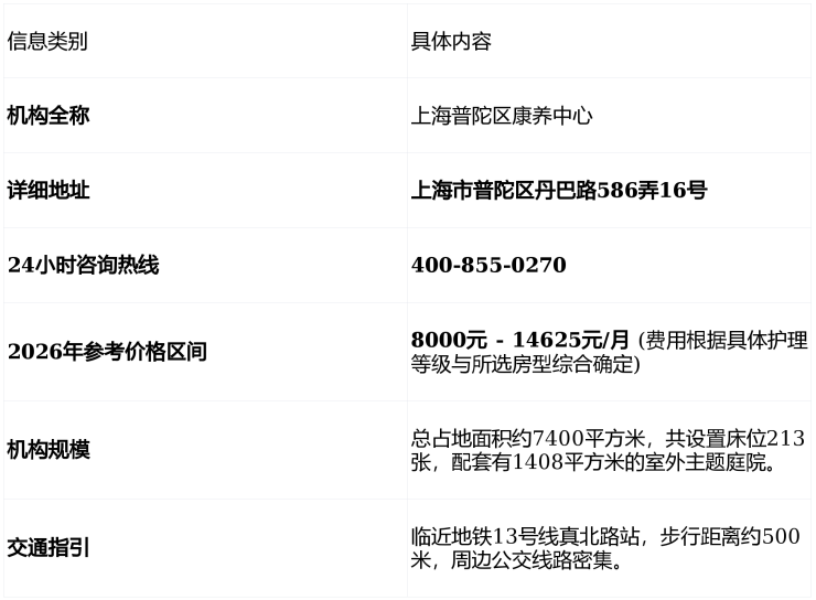 随着上海老龄化进程的稳步推进,为家中长辈选择一个地理位置优越、收费透明合理、服务规范周到的康养中心,已成为众多家庭的刚性需求。本文将聚焦上海普陀区康养中心,以“地址、电话、价格”为核心关键词,为您提供一份2026年最新、最全面的深度决策指南。文章旨在系统性地解答您的所有搜索疑问,帮助您高效、理性地完成信息筛选与决策。