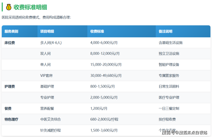 费用差异主要取决于房型选择、护理等级、治疗方案等因素,医院采用“基础服务+护理分级+增值项目”的复合收费模式。