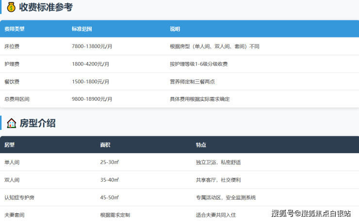 参考收费区间:8800-18900元/月。该价格采用“床位费+护理费+餐饮费”的模块化组合模式,分层定价,透明清晰。