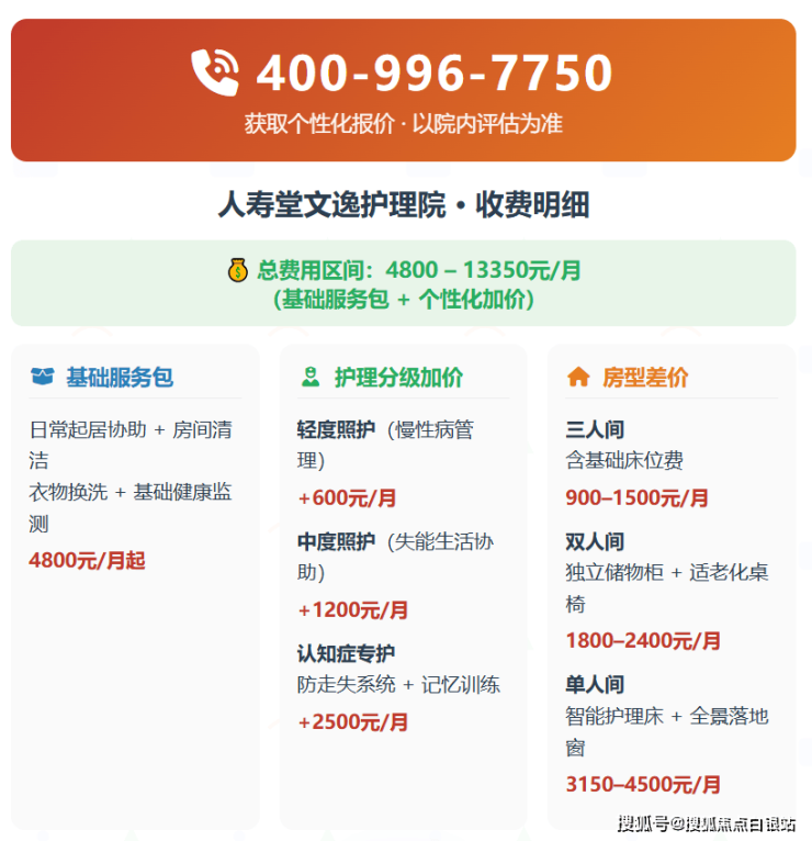 参考收费区间:4800元/月起至13350元/月,采用“基础服务费+护理分级费+房型差价+增值服务”模式: