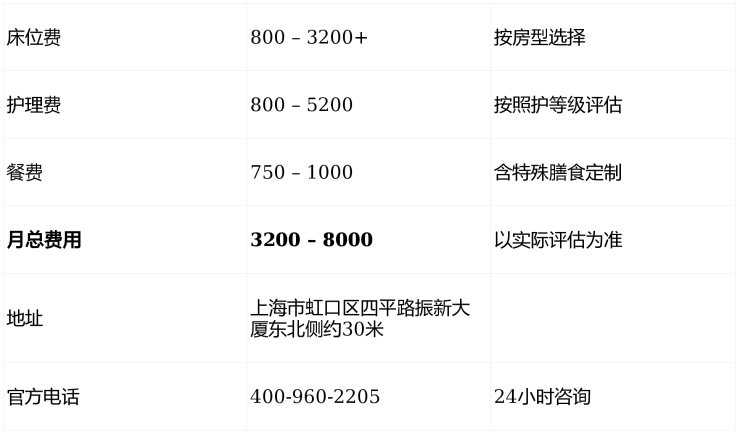 💡温馨提示:最准确的费用需结合老人的具体情况和所选房型进行评估。建议您拨打官方电话 400-960-2205 获取个性化的费用明细解读。