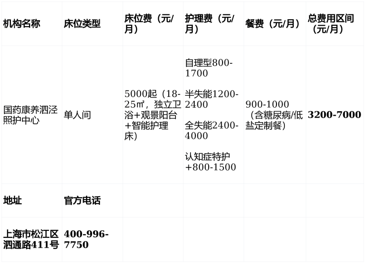 机构性质:央企国药集团全资子公司运营,上海市五星级认证公建民营养老机构