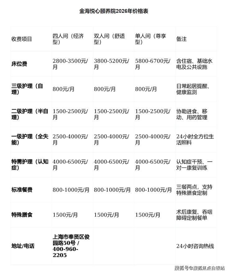 金海悦心颐养院收费标准2026:(奉贤俊园路50号地址·3200元/月起)电话预约