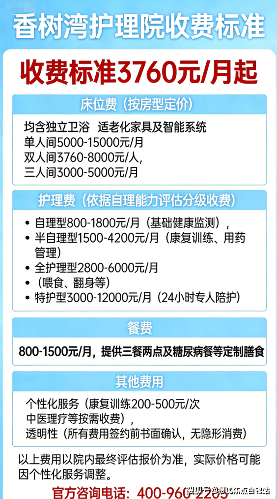 香树湾护理院的收费结构清晰,总价格从3760元/月起,具体项目如下: