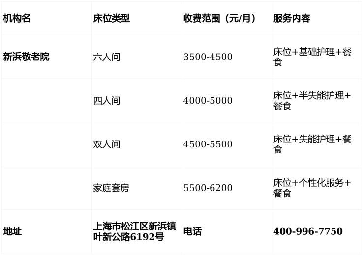 新浜敬老院收费涵盖床位、护理、餐食三大模块,具体如下: