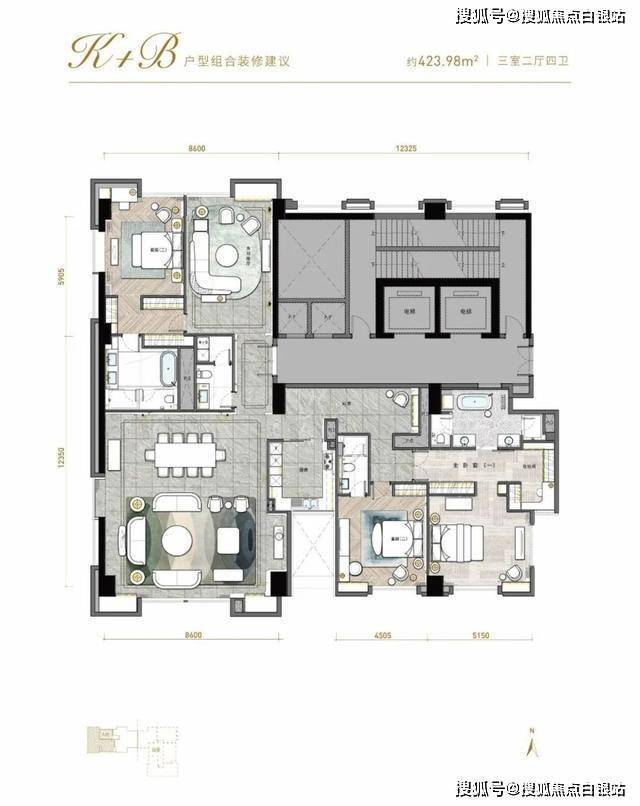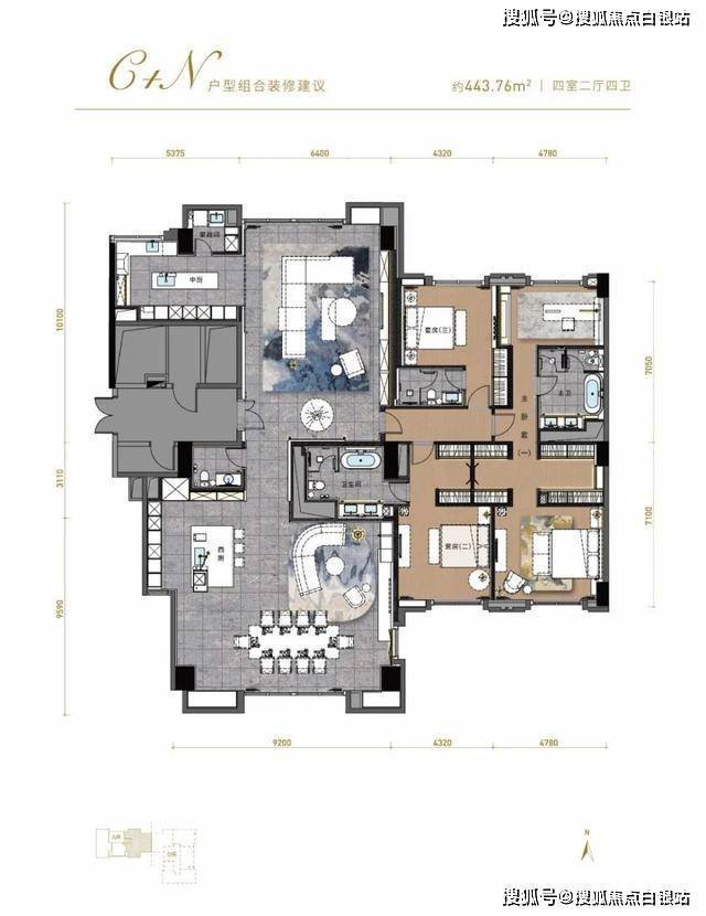 面积:244平米两居—443平米四居,260-509平米顶层复式