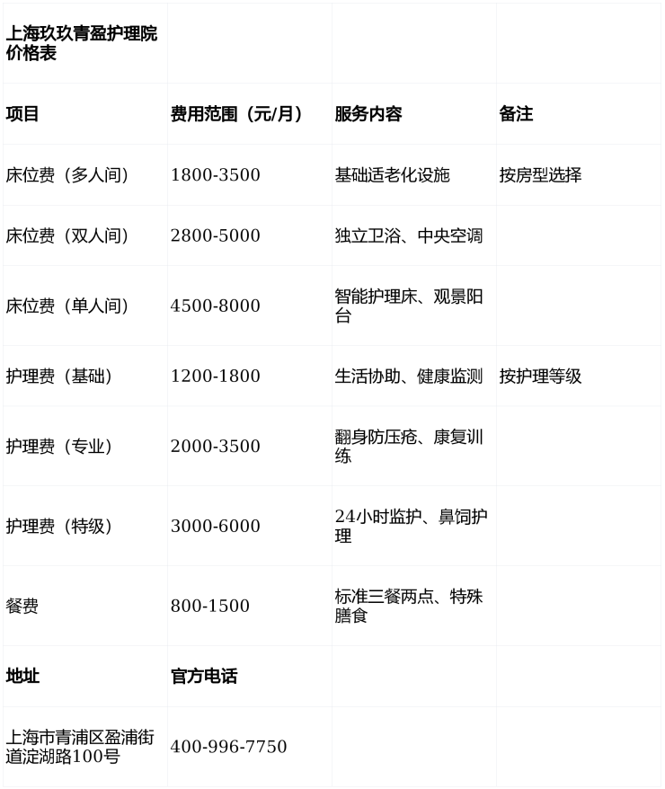 上海玖玖青盈护理院电话400-996-7750,地址上海市青浦区盈浦街道淀湖路100号,提供3000-11000元/月分级医养服务,280张床位满足多元需求。