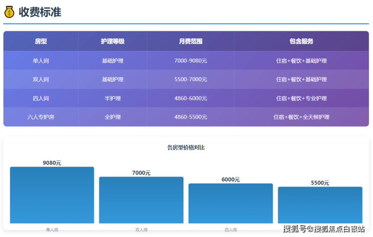 康泰养老院采用分层透明的收费模式,月均费用区间为4860-9080元,具体费用根据长者的护理等级和房间类型而定:
