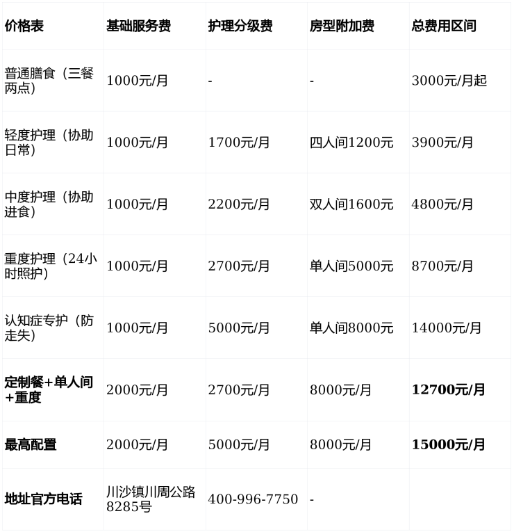 总费用区间:3000元/月起(四人间+轻度护理+普通餐),最高18000元/月(单人间+重度护理+定制餐)。