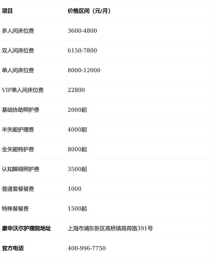 康申沃尔护理院(浦东医保)2026价格表:失能老人护理收费及电话热线详解