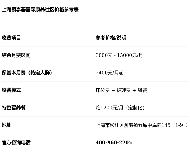 温馨提示:最准确的费用需结合老人的具体情况和所选房型进行评估。建议您拨打官方电话 400-960-2205 获取个性化的费用明细解读。