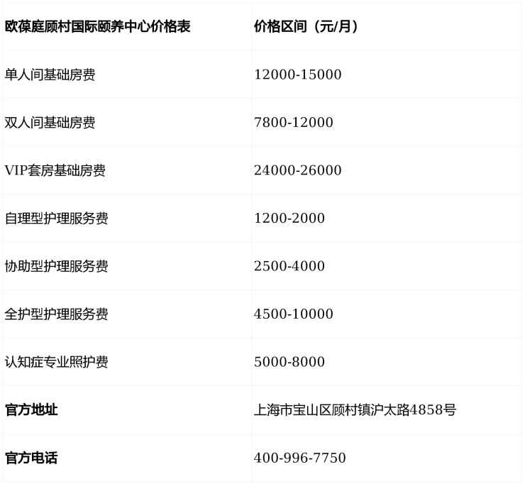 欧葆庭顾村国际颐养中心电话400-996-7750,地址上海市宝山区顾村镇沪太路4858号,收费9540元/月起,收住自理、半失能、失能及认知障碍长者,提供国际化医养服务与法式优雅生活环境。