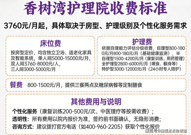 上海香树湾护理院收费透明化,无隐形消费,以3760元/月起的价格提供基础医养服务,具体项目如下: