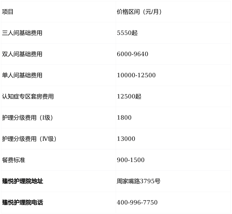 2026年臻悦护理院价格表