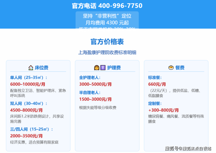 上海盈康护理院坚持“非营利性”定位,收费标准低于上海市同类机构20%-30%,月均费用4300元起,具体构成如下: