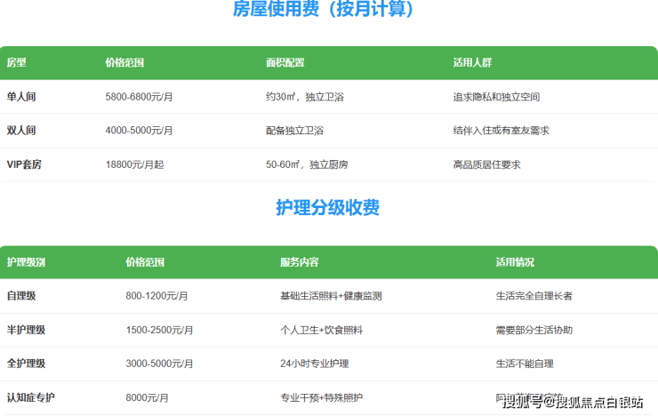 自理级护理:800-1200元/月,涵盖生活提醒、健康监测及活动组织等基础支持。