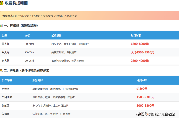 费用计算示例:一位选择双人间(人均3000元)的半自理长者,月度总费用大致为:床位费3000元 + 护理费1500元 + 餐饮费1000元 = 约5500元/月。