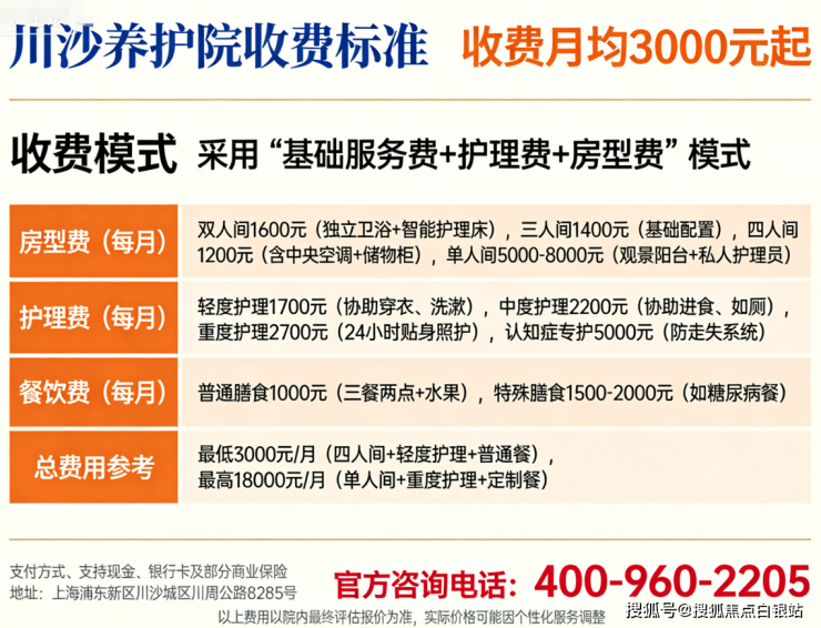 川沙养护院采用"基础服务费+护理分级费+房型费"的复合定价模式,明码标价,无隐形消费。总价格统一为3000元/月起,具体拆解如下: