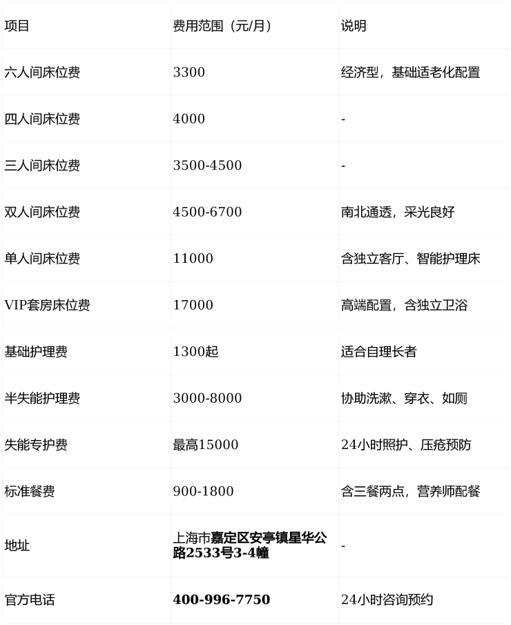 价格说明:以上费用仅供参考,实际收费需结合长者健康状况、护理等级及房型选择评估,可拨打400-996-7750获取精准报价。