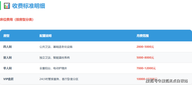 单人间:每月约7000-12000元。通常带有全景阳台、新风系统及电动护理床,私密性最佳。