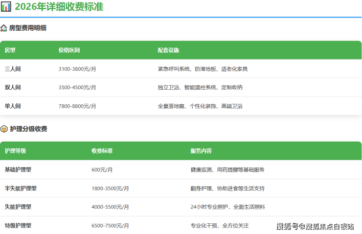 一位入住双人间、经评估需半失能护理的长者,月总费用大致为:房费(3500-4500元)+ 护理费(1800-3500元)=5300 - 8000元/月。