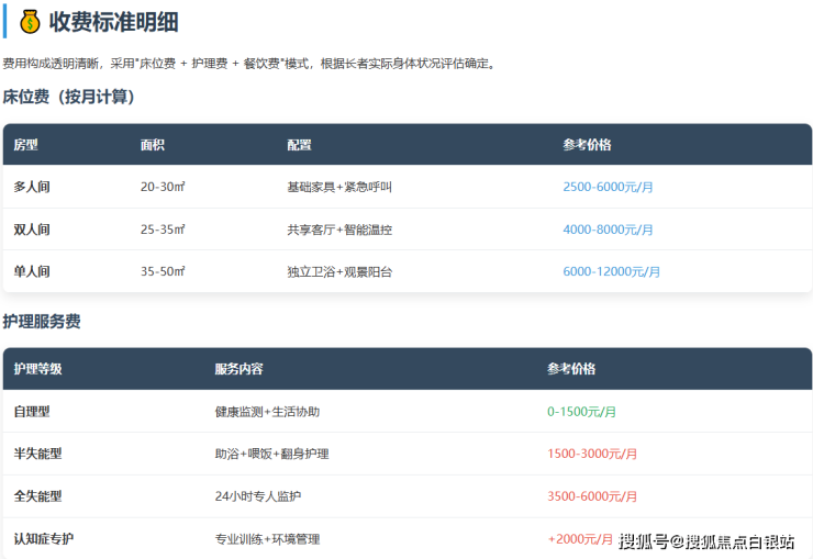 示例二(半失能长者选单人间):6000元(床位) + 2000元(护理) + 1000元(餐费) ≈9000元/月