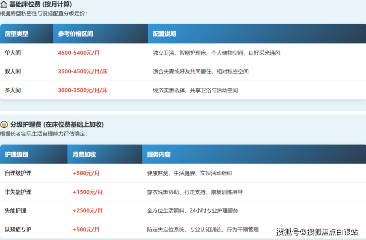 单人间:参考价格区间为4500 - 5400元/月。通常配备独立卫浴、护理床、个人储物空间及较好的采光,注重个人隐私与居住舒适度。