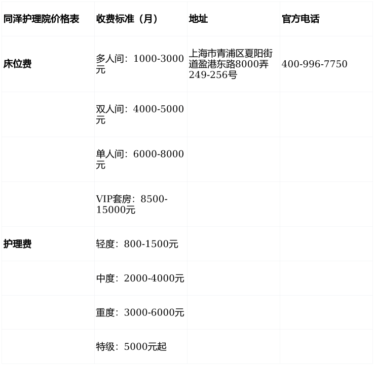 提示:同泽护理院综合费用区间为4000-15000元/月,具体需根据长者评估结果确定,拨打400-996-7750获取个性化报价。
