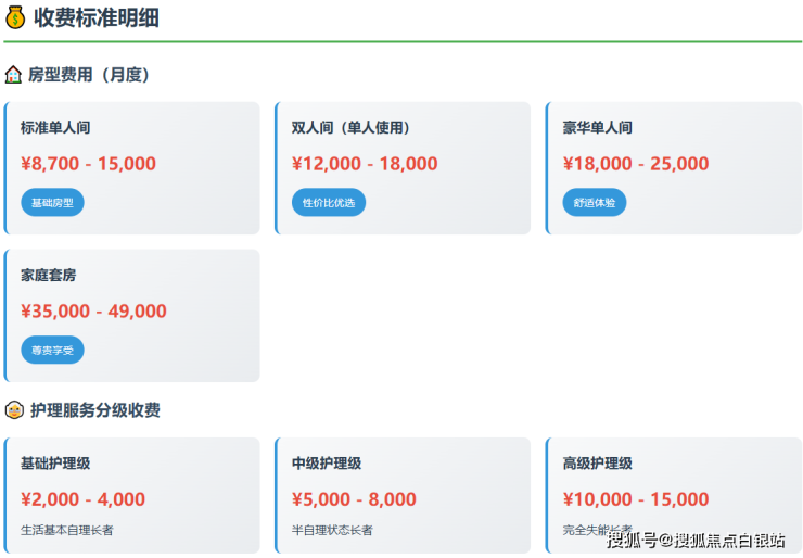 举例说明:一位选择标准单人间、需要中级护理的长者,月度总费用大致为:房型费(取中间值11850元)+ 护理费(取中间值6500元)+ 其他费用(取中间值2400元)=约20750元/月。